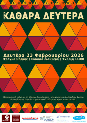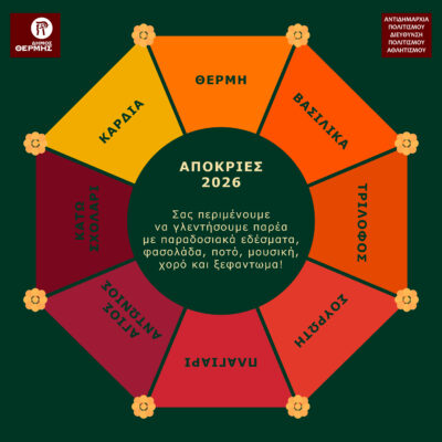 Σαρακοστιανά εδέσματα, μουσική, χορό, καρναβαλικές παρελάσεις και αυθεντικό αποκριάτικο ξεφάντωμα περιλαμβάνει και φέτος το πρόγραμμα των αποκριάτικων εκδηλώσεων που διοργανώνονται σε κοινότητες του Δήμου Θέρμης, με πρωτοβουλία της Αντιδημαρχίας Πολιτισμού, σε συνεργασία με τις τοπικές κοινότητες, συλλόγους και φορείς.